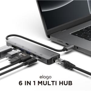 elagoの「6 IN 1 MULTI HUB」は、MacBook Pro、MacBook Air、iPad Pro向けのUSB Type-Cハブです。このハブは、複数のポートを提供し、さまざまなデバイスとの接続を簡単にします。以下はこのハブの主な特徴です:
